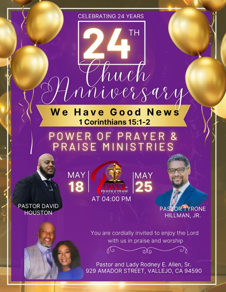 Pastor Hillman will be the guest speaker at Power of Prayer and Praise’s Church (Vallejo, CA) anniversary.