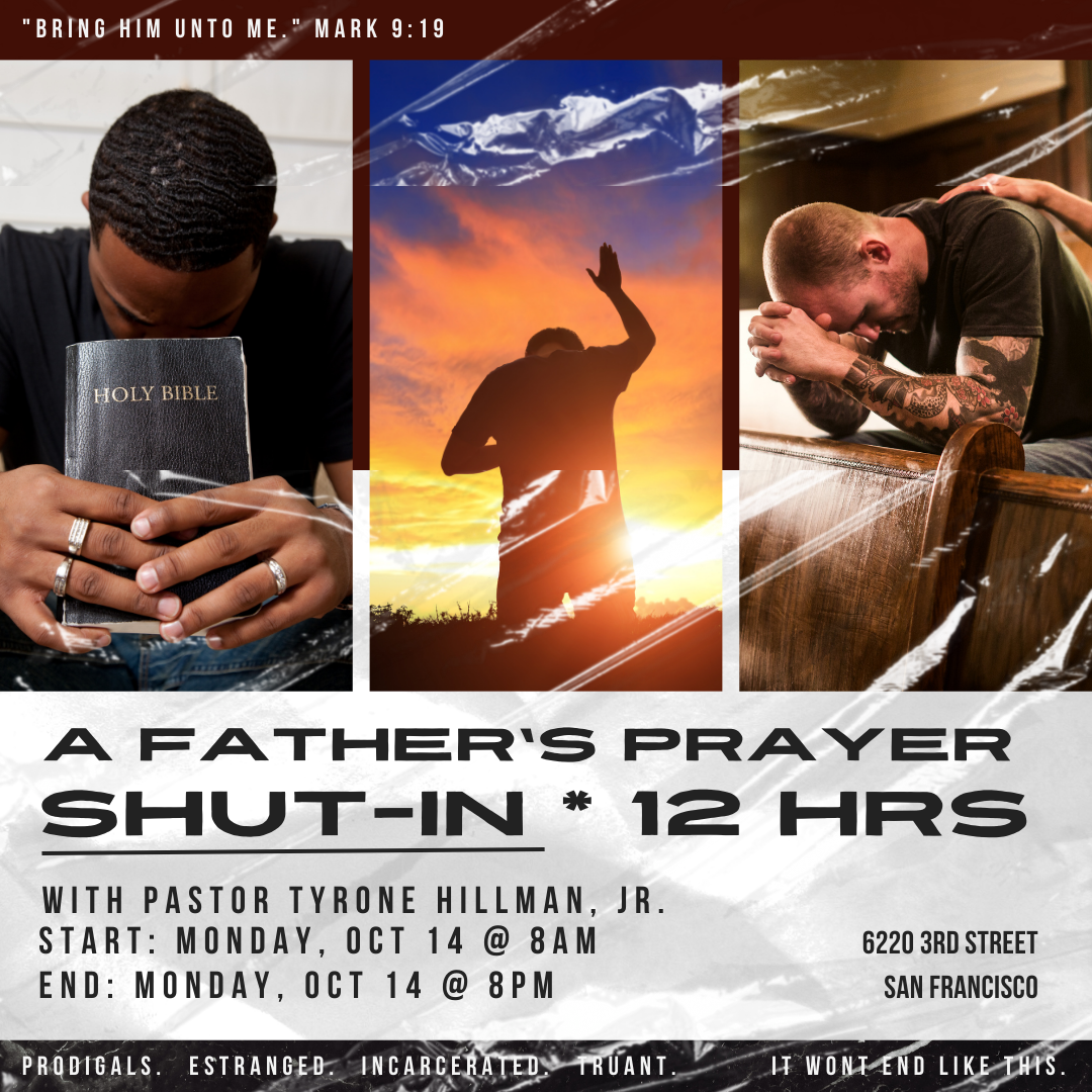 October 14, 2024 @ 8:00 am - 8:00 pm A Father’s Prayer – 12 Hour Shut-In The Center 6220 Third Street, San Francisco, CA, United States Please register!